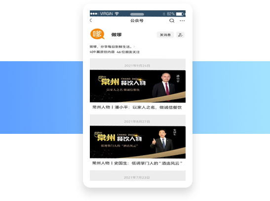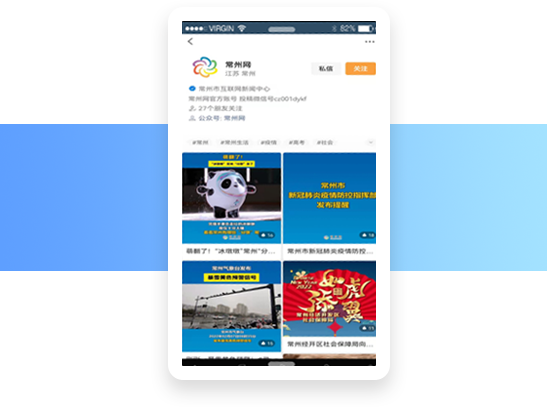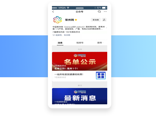 常州網微信公衆号于2012年9月正式上(shàng)線,目前粉絲46.3萬,2020年度常州微信排行榜冠軍,2021年度單篇閱讀數第一,2022年度常州微信排行榜媒體榜冠軍。擁有高(gāo)到(dào)達率、高(gāo)曝光率,爲客戶提供直接、有效的精準營銷和(hé)品牌傳播。