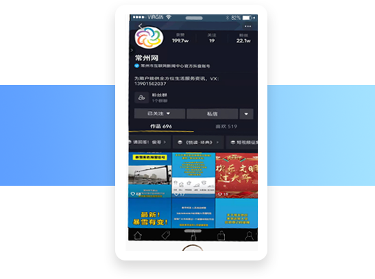 常州網抖音(yīn)号于2018年正式上(shàng)線,現(xiàn)粉絲24.2萬,總點贊數223.6萬,總點擊量超6000萬,在常州抖音(yīn)排行榜上(shàng)位列三甲。