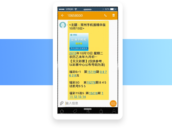 常州手機報(bào)2006年發刊,截止目前訂閱用(yòng)戶累計(jì)超50萬,覆蓋60%以上(shàng)爲知(zhī)識水(shuǐ)平高(gāo)、經濟基礎好(hǎo)、年齡層次在25-45歲對(duì)資訊高(gāo)度敏感的中堅階層。 常州手機報(bào)緊扣常州本地定位、立足服務市民,通過彩信提供高(gāo)度聚集、生動鮮活的新聞内容和(hé)豐富實用(yòng)的生活資訊。